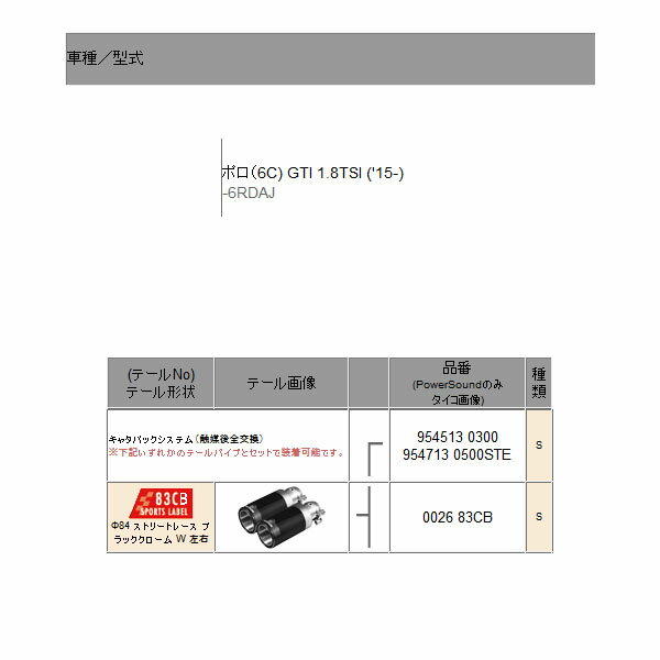 □適合車種車 種 名:フォルクスワーゲン ポロ(6C)型 式:6RDAJ年 式:2015〜エ ン ジ ン:1.8TSIグ レ ー ド:GTIそ の 他:-□出品商品メ ー カ ー:REMUS商 品 名:レムスマフラー品 番:954513 0300 + 954713 0500STE + 0026 83CBR交換方法:-備 考:Eマーク取得済み・保安基準適合・車検対応品メインサイレンサーとテールのセットREMUSロゴデザインが変更となりました。
